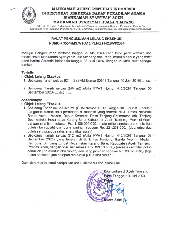 Ralat Pengumuman Eksekusi Lelang Nomor 2/Pdt.Eks/2023/Ms.Ksg
