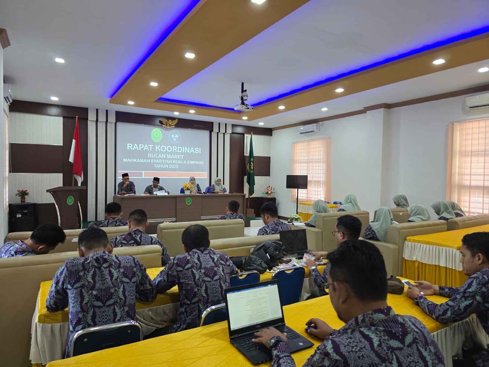 Jumat, 7/3/2025. Bertempat di Aula A. Sobardi Mahkamah Syar'iyah Kuala Simpang dilaksanakan Rapat Koordinasi Bulanan yang dipimpin langsung oleh Ketua Mahkamah Syar'iyah Kuala Simpang (Dr. Nusra Arini, S.H.I., M.H.) didampingi oleh Wakil Ketua (Muhammad Reza Fahlepi, S.H.I., M.H.), Panitera (Khalidah, S.Ag., M.H.), Sekretaris (Mansur, S.T.), serta dihadiri Para Hakim, Pejabat Struktural, Pejabat Fungsional, dan PPNPN Mahkamah Syar'iyah Kuala Simpang.