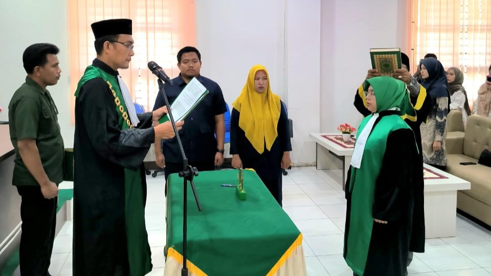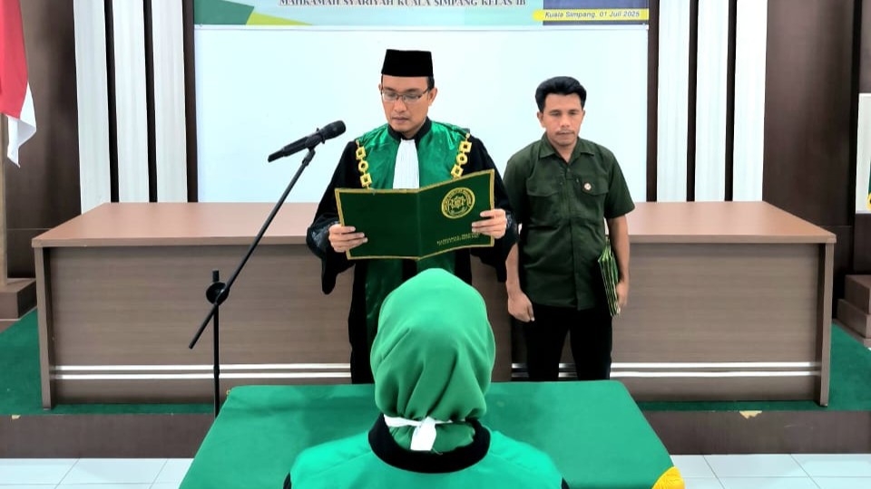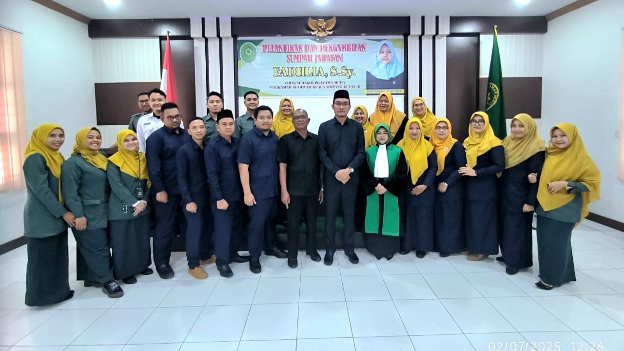 Bertempat di Ruang A.Sobardi Mahkamah Syar'iyah Kuala Simpang telah dilaksanakan Pelantikan dan Pengambilan Sumpah Jabatan kepada Fadhlia, S.Sy. sebagai Hakim Pratama Muda di Mahkamah Syar'iyah Kuala Simpang Kelas IB oleh Ketua Mahkamah Syar'iyah Kuala Simpang Surya Darma Panjaitan, S.H.I., M.H yang dihadiri oleh seluruh aparatur MS Kuala Simpang dan tamu lainnya.