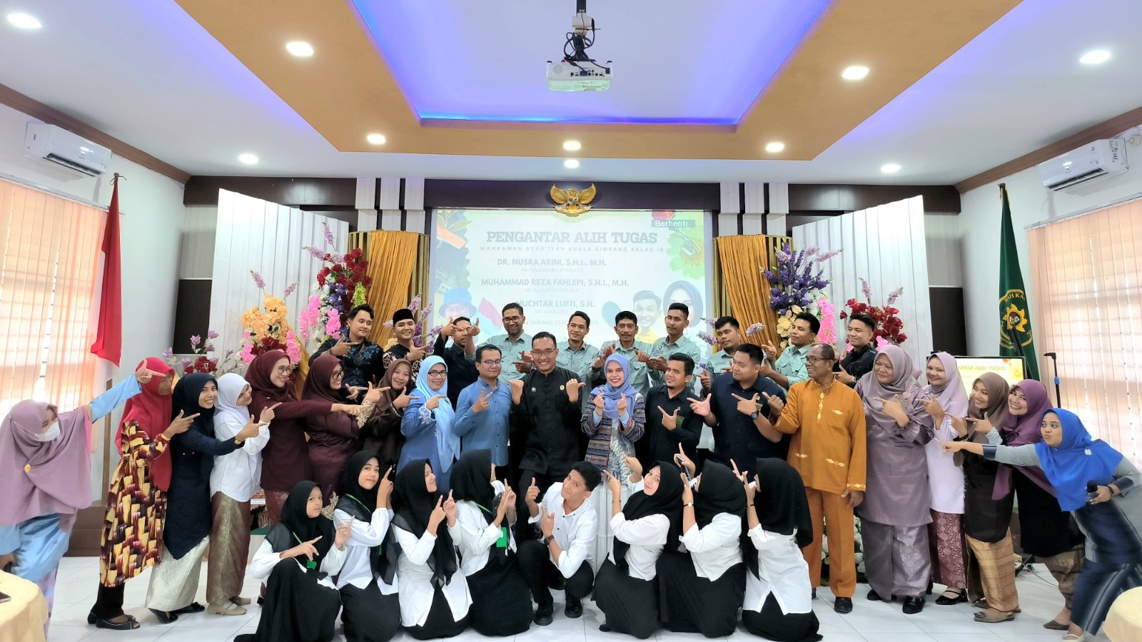 Pengantar alih tugas pengadilan adalah acara perpisahan atau serah terima jabatan bagi pegawai pengadilan yang akan berpindah tugas ke tempat lain, baik karena promosi, mutasi, atau pensiun. Bertempat di Aula Mahkamah Syar'iyah Kuala Simpang telah dilaksanakan acara Pengantar Alih Tugas Ibu Dr. Nusra Arini, S.H.I., M.H. selaku Ketua Mahkamah Syar'iyah Kuala Simpang pada periode 2024-2025 yang dipromosikan sebagai Ketua Pengadilan Agama Tanjung Balai Kelas II, Bapak Muhammad Reza Fahlepi, S.H.I., M.H. selaku Wakil Ketua Mahkamah Syar'iyah Kuala Simpang pada periode 2023-2025 yang dipromosikan sebagai Ketua Mahkamah Syar'iyah Blangpidie Kelas II, Bapak Muchtar Lufti, S.H. selaku Analis Perkara Peradilan Mahkamah Syar'iyah Kuala Simpang pada periode 2020-2025 yang dipromosikan sebagai Panitera Pengganti Mahkamah Syar'iyah Idi Kelas II, Rabu (13/08/2025).