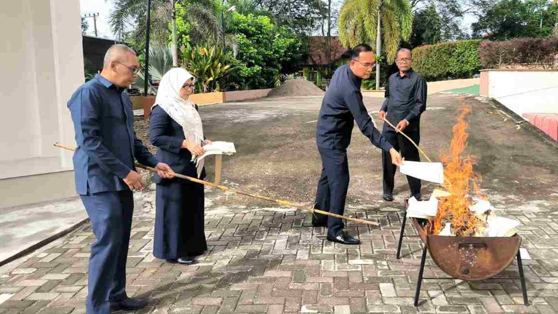 Pemusnahan blanko dilakukan secara simbolis dengan cara dibakar bersama-sama, sebagai bentuk komitmen satuan kerja dalam menjaga keamanan dokumen negara dan memastikan bahwa seluruh proses administrasi mengikuti sistem yang baru berbasis digital. Terdapat 6 bundle blanko Akta Cerai tahun 2025 yang telah dimusnahkan pada kegiatan ini.