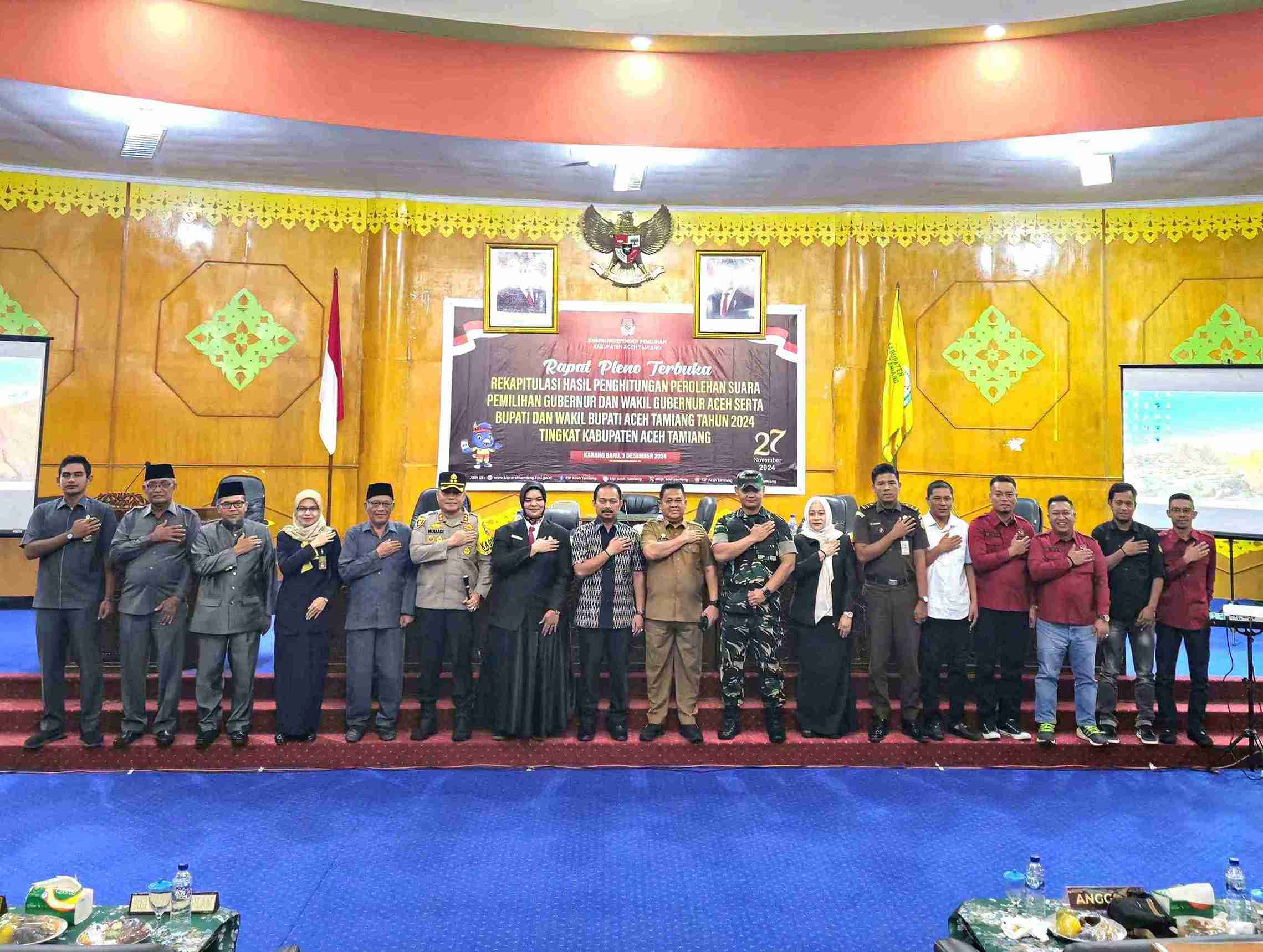 Rapat Pleno tersebut dihadiri juga oleh Pj. Bupati Aceh Tamiang, Ketua DPRK Aceh Tamiang, Kapolres Aceh Tamiang, Dandim 0117/Aceh Tamiang, Perwakilan dari Kejaksaan Negeri Aceh Tamiang, Perwakilan dari PN Kuala Simpang, Ketua MPU Aceh Tamiang, Ketua MAA Aceh Tamiang, Ketua MPD Aceh Tamiang, Ketua KIP Aceh Tamiang, Para Komisioner KIP Aceh Tamiang, seluruh PPK dalam wilayah Kabupaten Aceh Tamiang, para Saksi yang berasal dari Partai pengusung, Insan Pers serta tamu undangan lainnya.