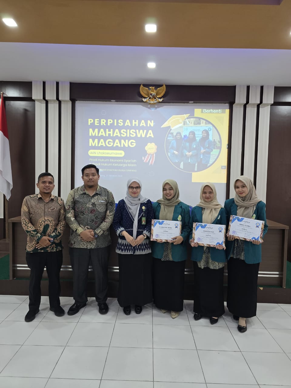 Acara ditutup dengan pemberian sertifikat penghargaan kepada setiap mahasiswa magang sebagai tanda apresiasi atas dedikasi dan kontribusi mereka selama magang yang diharapkan dapat menjadi tambahan berharga dalam portofolio mereka saat memasuki dunia profesional.