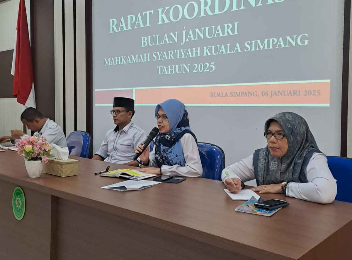 Senin, 6/1/2025. Bertempat di Aula A.Sobardi Mahkamah Syar'iyah Kuala Simpang digelar Rapat Koordinasi Bulan Januari Tahun 2025 yang dipimpin langsung oleh Ketua MS Kuala Simpang (Dr. Nusra Arini, S.H.I., M.H.) didampingi Wakil Ketua (Muhammad Reza Fahlepi, S.H.I., M.H.), Sekretaris (Mansur, S.T.) dan Panitera (Khalidah, S.Ag., M.H.). Rapat tersebut juga diikuti oleh Hakim, Para Pejabat Struktural dan Pejabat Fungsional serta Para PPNPN MS Kuala Simpang.