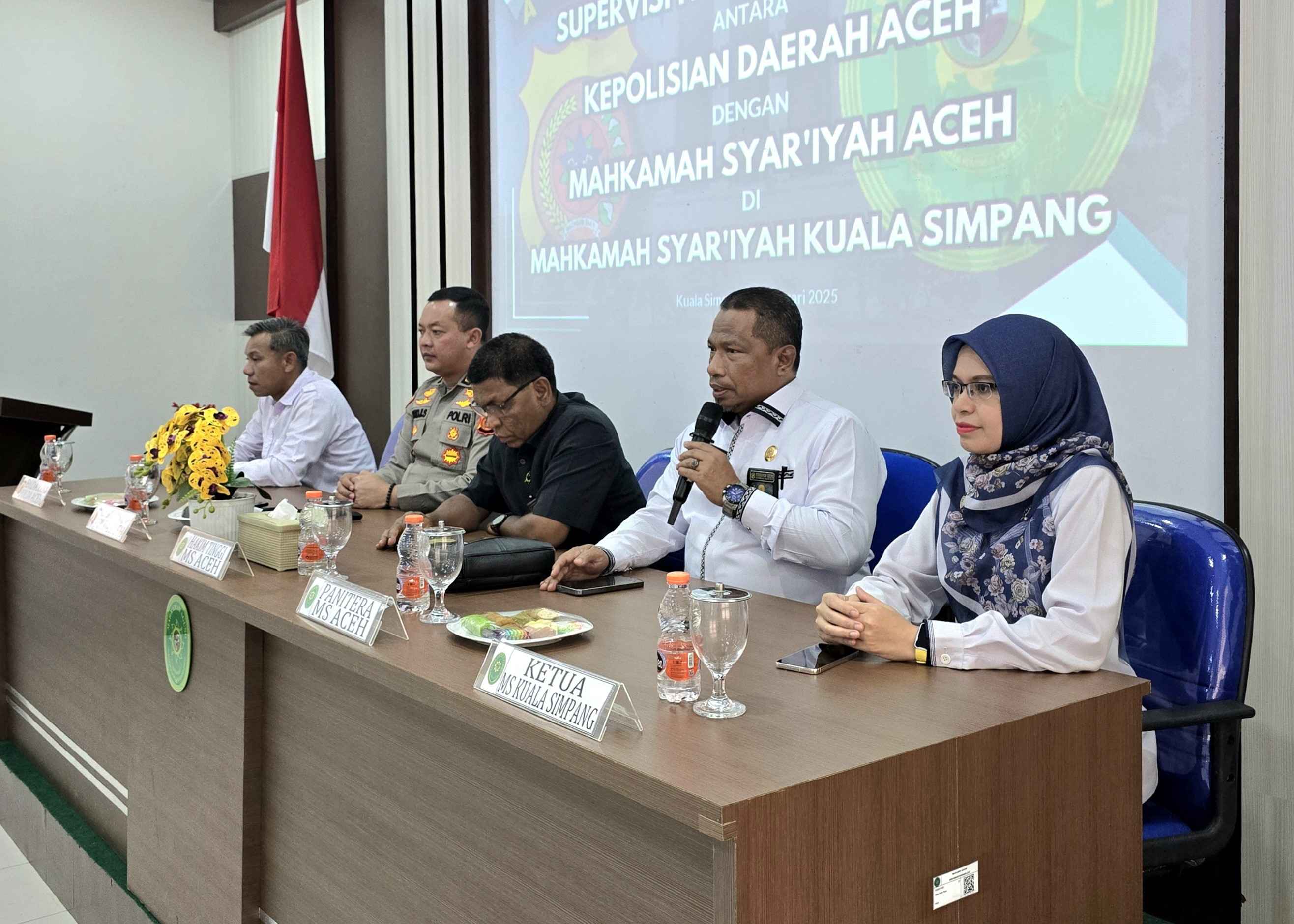 Sebagai wujud semangat memperkuat sinergi dan kolaborasi di bidang penegakan hukum, Tim Sosialisasi dan Supervisi Nota Kesepahaman antara Polda Aceh dengan Mahkamah Syar'iyah Aceh yang diketuai oleh Bapak AKBP Pandji Santoso, S.I.K., M.Si. bersama jajaran Polres Aceh Tamiang berkunjung ke Mahkamah Syar'iyah Kuala Simpang, Senin (20/01/2025). Kunjungan tersebut didampingi oleh Hakim Tinggi Mahkamah Syar'iyah Aceh Bapak Dr. Drs. Amiruddin, S.H., M.H. dan Panitera Mahkamah Syar'iyah Aceh Bapak Drs. Abd. Khalik, S.H., M.H.