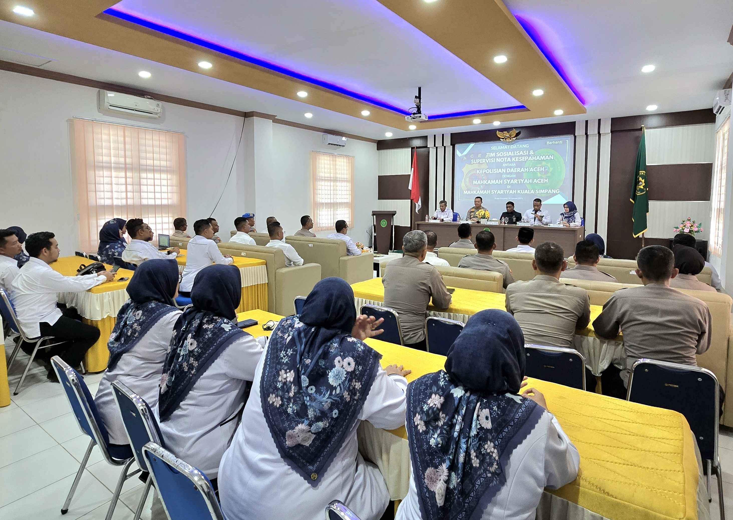 Kegiatan Sosialisasi dan Supervisi Nota Kesepahaman antara Polda Aceh dengan Mahkamah Syar'iyah Aceh ini bertempat di Aula A. Sobardi Mahkamah Syar'iyah Kuala Simpang dihadiri oleh Ketua MS Kuala Simpang (Dr. Nusra Arini, S.H.I., M.H.), Wakil Ketua MS Kuala Simpang (Muhammad Reza Fahlepi, S.H.I., M.H.), Hakim MS Kuala Simpang (Ahmad Arif Daniel, S.H.I., M.Ag.), Panitera MS Kuala Simpang (Khalidah, S.Ag., M.H.), Sekretaris MS Kuala Simpang (Mansur, S.T.), Pejabat Struktural dan Fungsional, Pegawai lainnya yang berhadir.