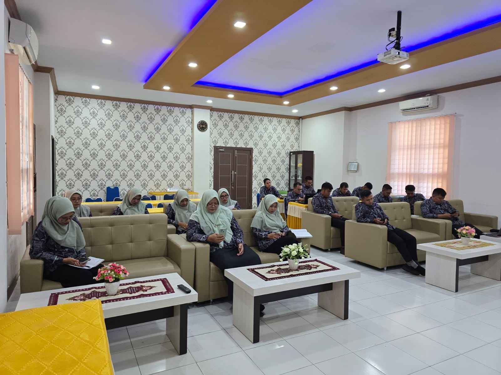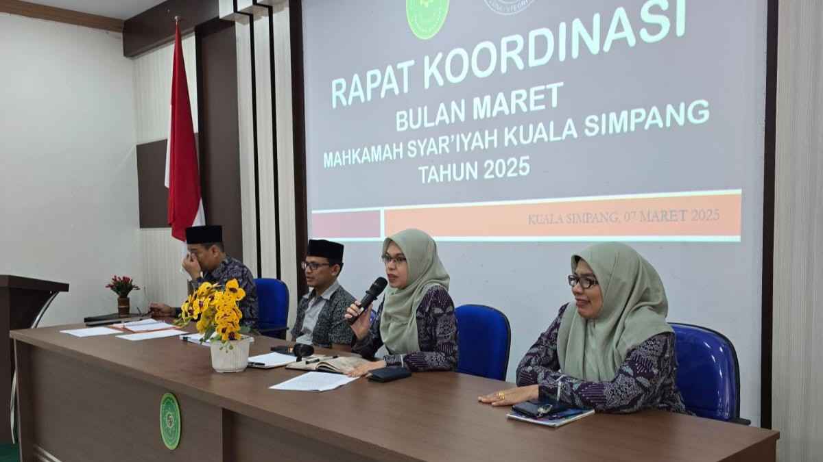 Jumat, 7/3/2025. Bertempat di Aula A. Sobardi Mahkamah Syar'iyah Kuala Simpang dilaksanakan Rapat Koordinasi Bulanan yang dipimpin langsung oleh Ketua Mahkamah Syar'iyah Kuala Simpang (Dr. Nusra Arini, S.H.I., M.H.) didampingi oleh Wakil Ketua (Muhammad Reza Fahlepi, S.H.I., M.H.), Panitera (Khalidah, S.Ag., M.H.), Sekretaris (Mansur, S.T.), serta dihadiri Para Hakim, Pejabat Struktural, Pejabat Fungsional, dan PPNPN Mahkamah Syar'iyah Kuala Simpang.