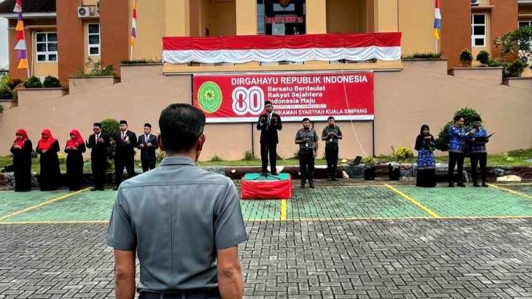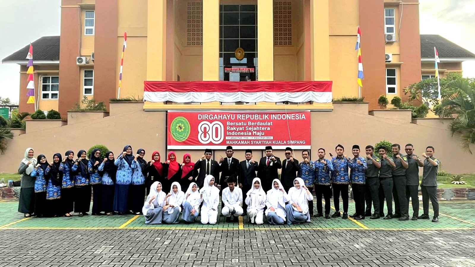 Upacara peringatan HUT Kemerdekaan RI ke-80 yang mengusung tema “Bersatu Berdaulat Rakyat Sejahtera Indonesia Maju” ini diikuti oleh Para Hakim, Panitera, Sekretaris, Pejabat Struktural dan Fungsional, Para ASN Mahkamah Syar’iyah Kuala Simpang serta Hakim Pengadilan Agama Stabat (Drs. T. Syarwan), Siswa PKL dari SMK Negeri 2 Karang Baru, SMK Negeri 1 Kuala Simpang serta SMK Misra Kuala Simpang.
