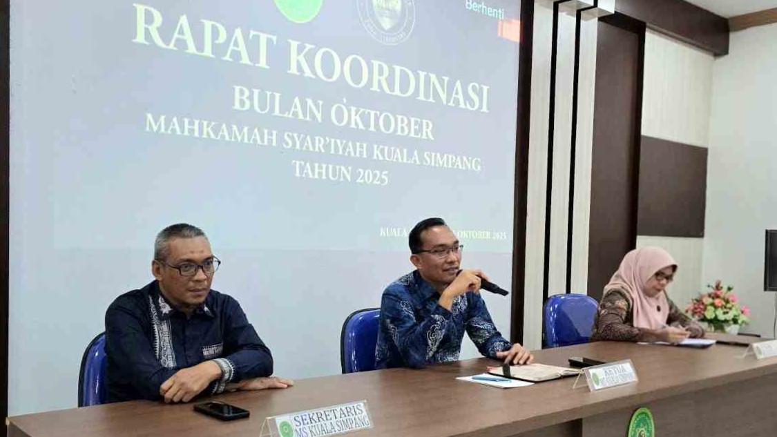 Mahkamah Syar'iyah Kuala Simpang kembali menyelenggarakan Rapat Koordinasi (Rakor) Bulanan untuk periode Oktober 2025. Kegiatan rutin ini bertujuan mengevaluasi capaian kinerja bulan sebelumnya sekaligus memantapkan rencana kerja menuju akhir tahun anggaran. Rakor yang dipimpin langsung oleh Ketua MS Kuala Simpang Bapak Surya Darma Panjaitan, S.H.I, M.H. dan seluruh aparatur turut hadir dalam kegiatan rapat di Aula MS Kuala Simpang tersebut, Jumat (24/10/2025).