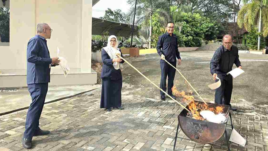 Sebagai tindak lanjut atas penerapan Elektronik Akta Cerai (EAC) yang mulai diberlakukan secara nasional sejak 1 Juli 2025, Mahkamah Syar’iyah Kuala Simpang melaksanakan kegiatan pemusnahan Barang Milik Negara (BMN) berupa blanko akta cerai tahun 2025.
