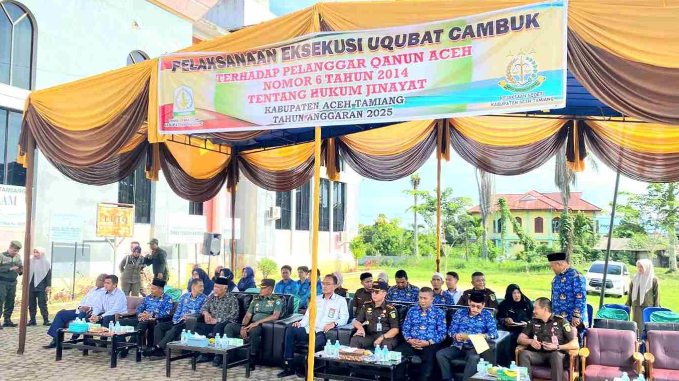 Hadir pada kegiatan tersebut Ketua Mahkamah Syar’iyah Kuala Simpang, Surya Darma Panjaitan, S.H.I., M.H., didampingi unsur Hakim, Panitera, serta Panitera Muda Mahkamah Syar’iyah Kuala Simpang. Eksekusi cambuk tersebut disaksikan oleh Pimpinan jajaran Pemerintah Kab. Aceh Tamiang, Unsur Forkopimda, Ketua MAA, Ketua MPU, Ketua Satpol PP dan WH, Kepala Lapas Kualasimpang, insan Pers dan Masyarakat serta adik-adik siswa/siswi yang hadir. Rangkaian kegiatan berjalan dengan tertib, lancar, dan penuh pengawasan dari aparat terkait, dimulai dari pembacaan ayat suci Al-Quran, Laporan Panitia, sambutan Kepala Kejaksaan Negeri Aceh Tamiang, hingga jalannya eksekusi uqubat cambuk.