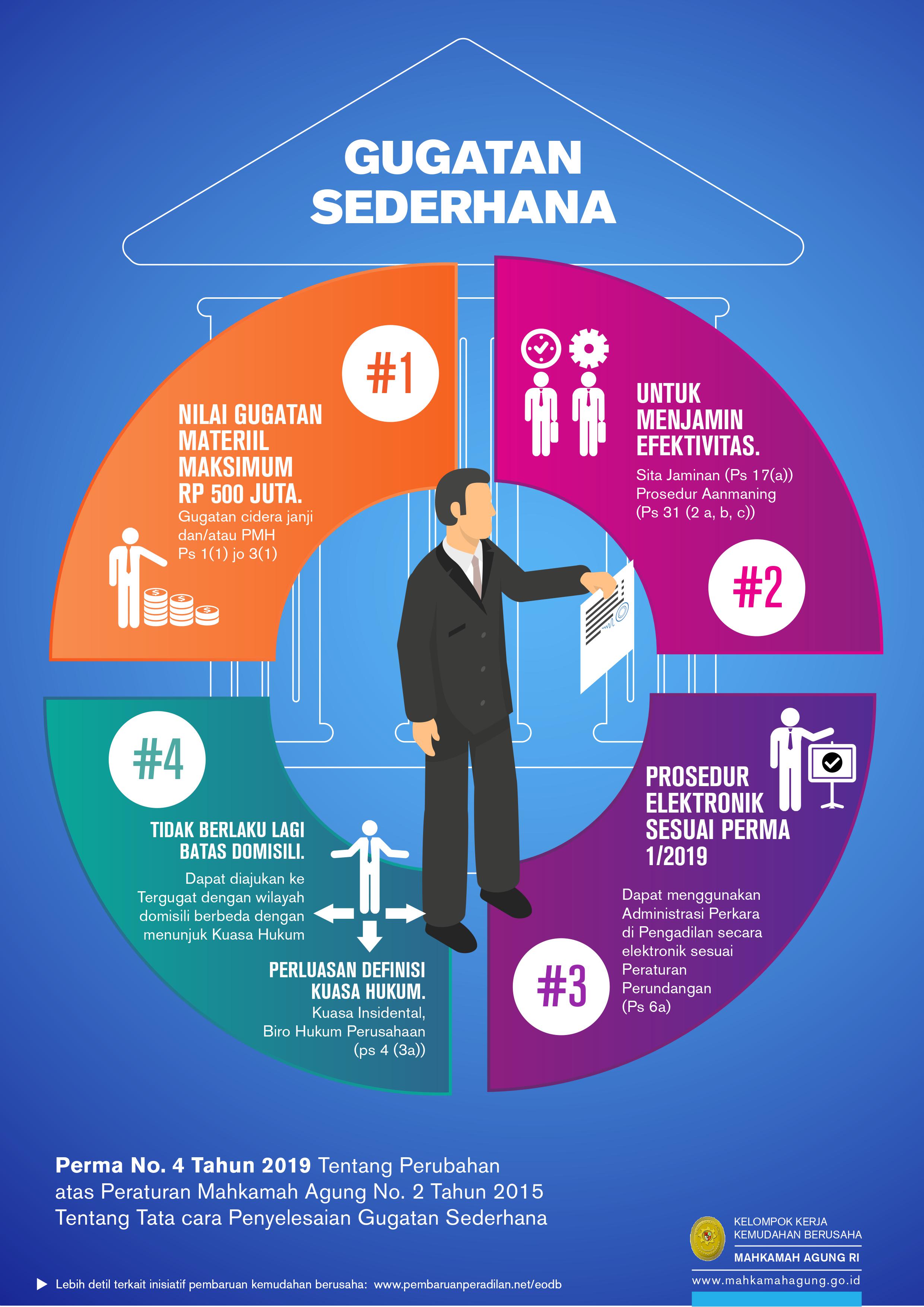 Peraturan Mahkamah Agung RI Nomor 4 Tahun 2019 tentang Perubahan atas Peraturan Mahkamah Agung Nomor 2 Tahun 2015 tentang Tata Cara Penyelesaian Gugatan Sederhana diterbitkan bertujuan untuk mempercepat proses penyelesaian perkara sesuai asas peradilan sederhana, cepat, biaya ringan. Terbitnya Peraturan Mahkamah Agung RI Nomor 4 Tahun 2019 ini juga salah satu cara mengurangi volume perkara di Mahkamah Agung dan sebagai perubahan atas Peraturan Mahkamah Agung Nomor 2 Tahun 2015, serta diadopsi dari sistem peradilan small claim court yang salah satunya diterapkan di London, Inggris.